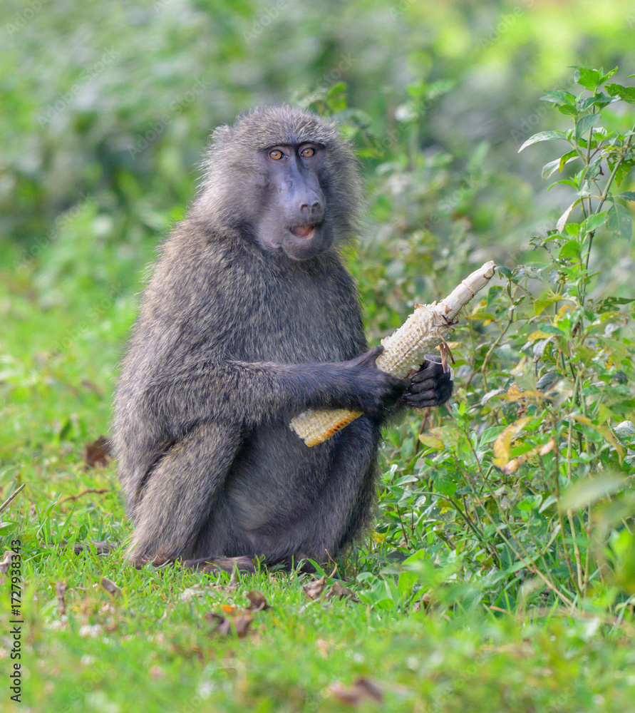 Olive baboon (Papio anubis) eating a fried corn stolen from tourists, Mount Elgon National park, Kenya.