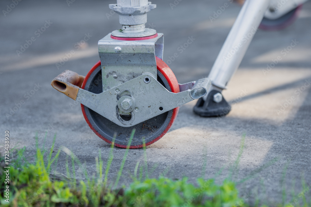 Close-up of industrial swivel caster wheel with red rubber tire attached to aluminum scaffold structure showing mechanical precision, mobility component design and engineering functionality