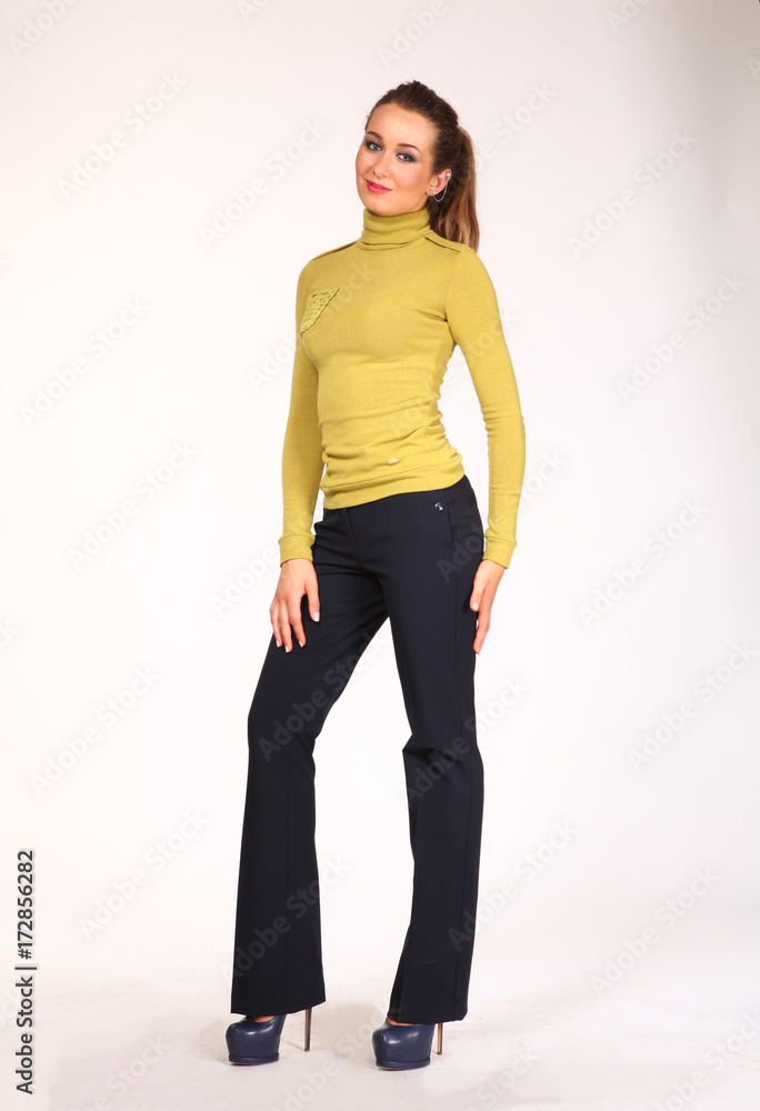 business woman with pony tail hair style yellow blouse trousers stiletto heels shoes full body portrait isolated on white