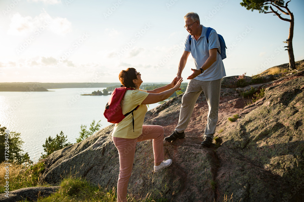 Active senior couple hiking on the top of rock. Mature man helping woman climbing up. Happily smiling. Scenic view of gulf and sea. Healthy lifestyle. Finland.