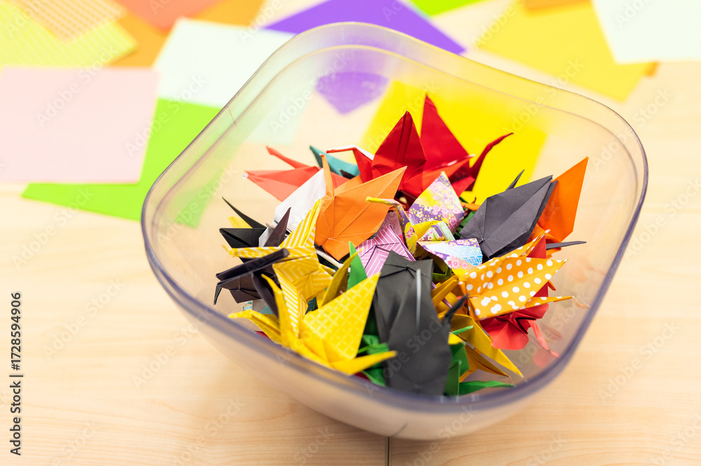 Origami paper birds in glass vase, colorful handmade crane figures home decoration art