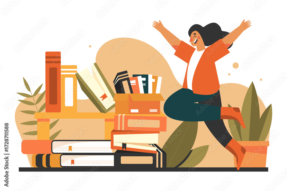 Enthusiastic Woman Jumping Beside Stack of Books with Transparent Background Celebrating Book Giving Day Wearing Casual Orange Cardigan and Teal Pants