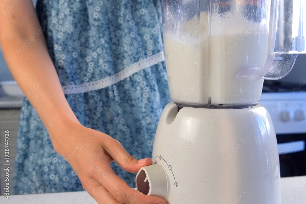 Woman mixing ingredients mint, condensed milk, lime juice in blender preparing cooking Brazilian lemonade on kitchen at home. Recipe cuisine culinary. Prepare citrus fruit dessert homemade beverage.