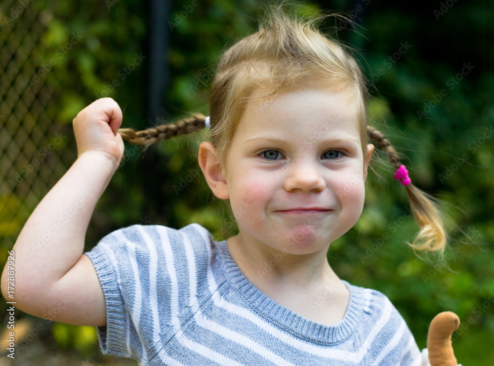 smiling toddler little blond girl with plaits close up photo on summer green background