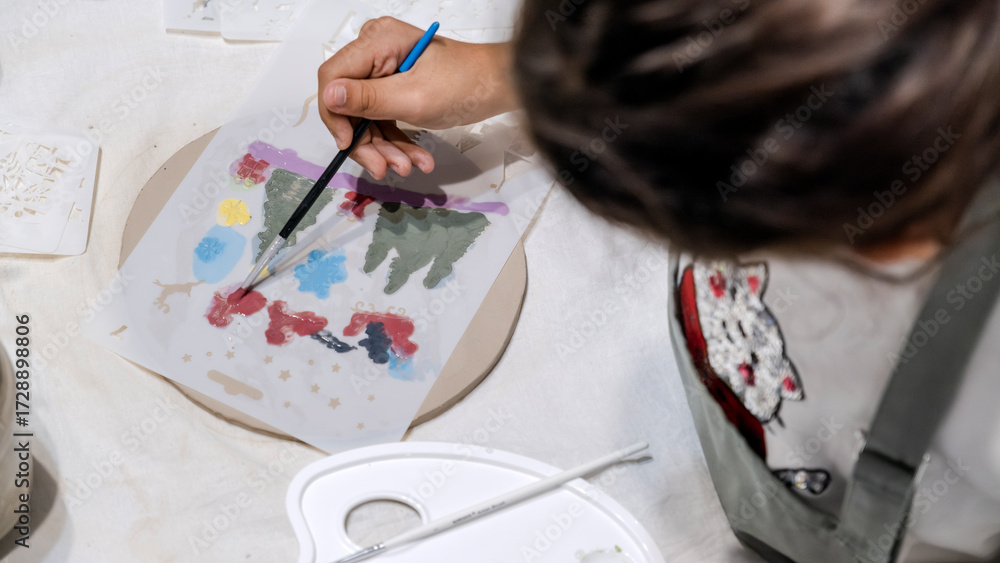 During an art event in a studio, middle age woman is painting Christmas ornament shapes she crafted on clay