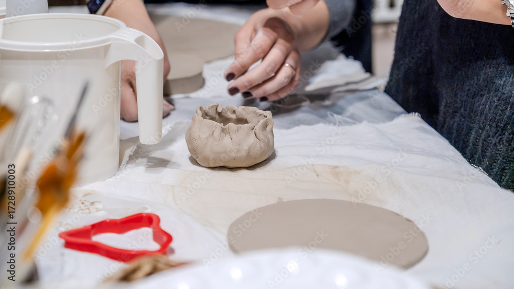 In an art studio a beautiful middle-aged woman artist is shaping clay at a table