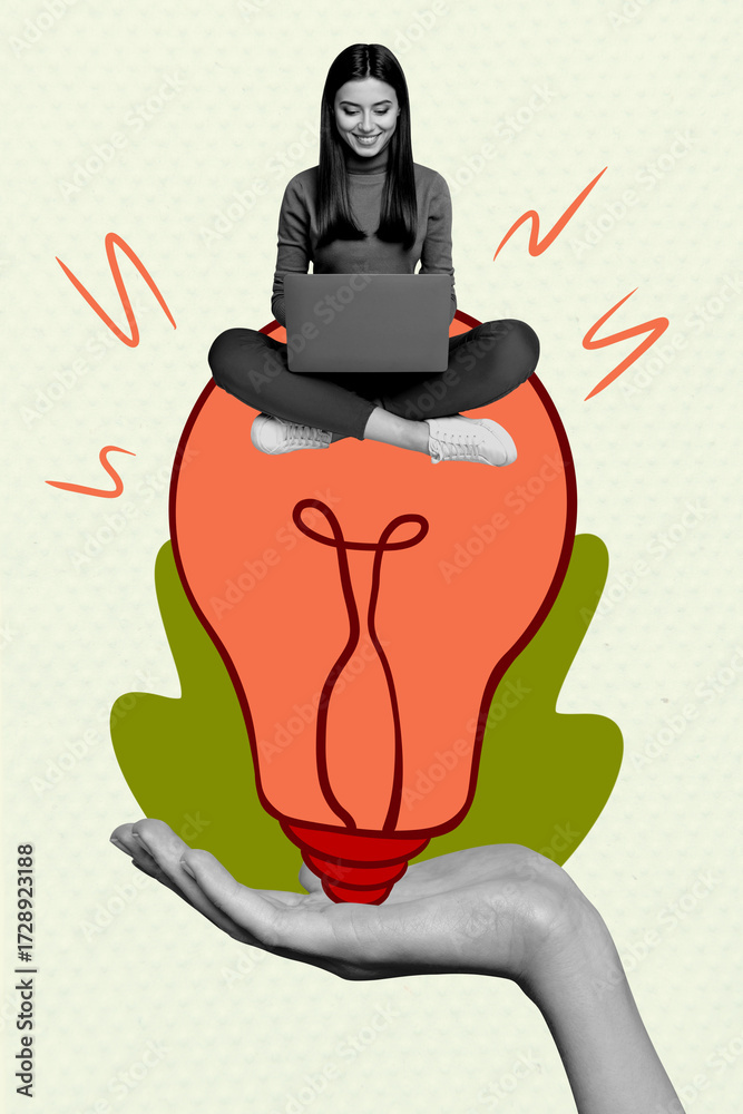 Trend artwork sketch montage 3D collage of hand hold idea light bulb young lady sit work laptop eureka solution logic creative challenge