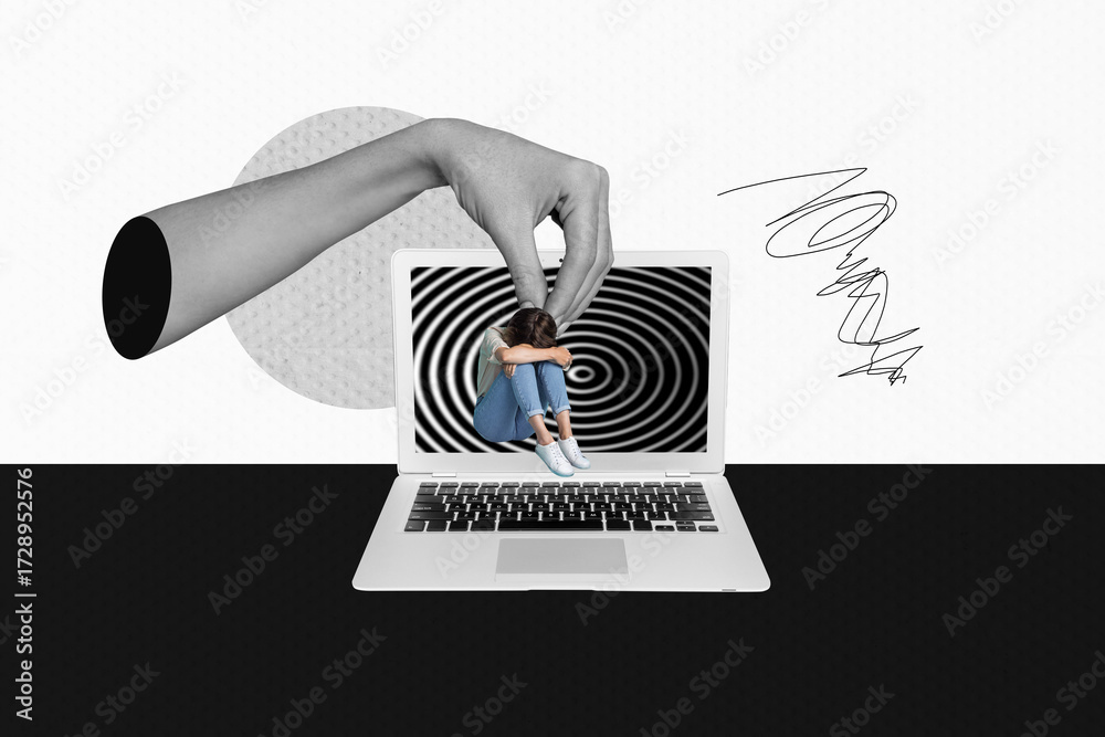 Collage portraying laptop computer smartphone addiction manipulation through digital lies hypnotic propaganda illusions