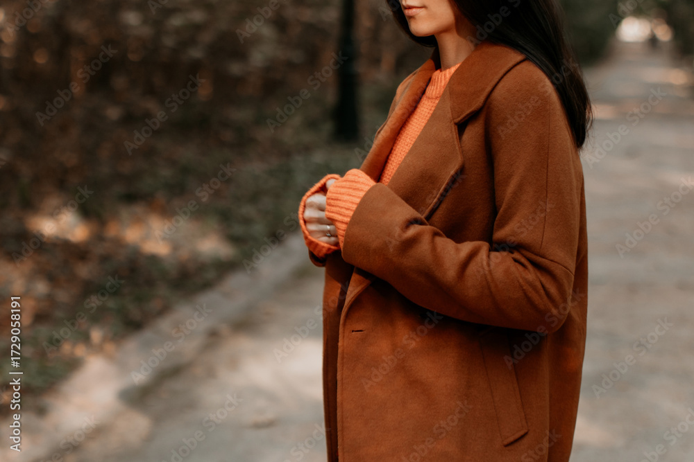 Side view of warm brown classy coat and orange sweater, fall seasonal women's fashion