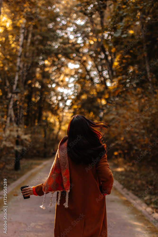 Outdoor autumnal portrait of brunette woman wearing classy brown coat and walking in the forest, fall seasonal fashion