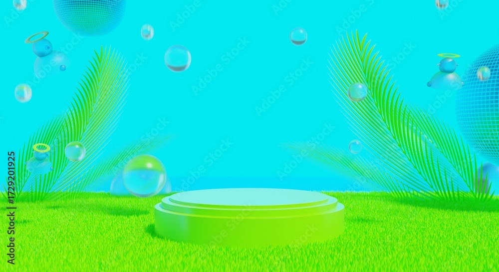 retro-future y2k 2000s frutiger aero aqua web 2.0 gloss with stage podium for product display showcase, 3d illustration rendering abstract background, technology and nature concept