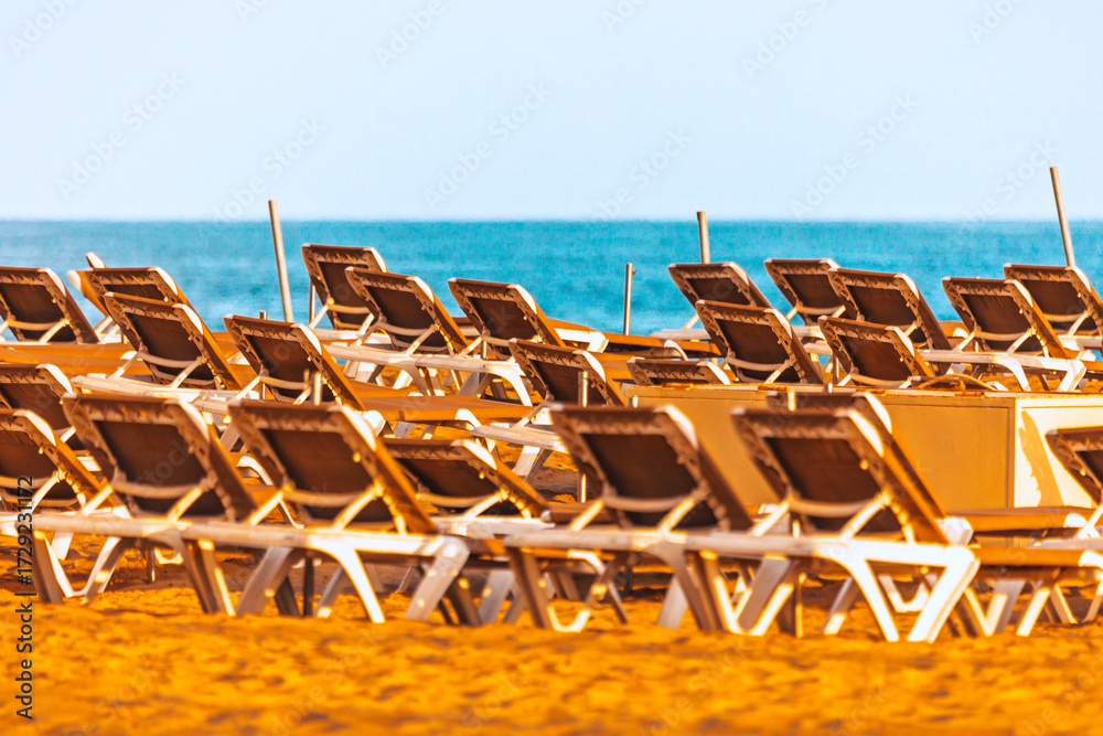 Rows of sunlit beach loungers sit empty on golden sand, framed by blue sea under a cloudless sky. Relaxing scene evokes summer vacation, travel, and leisure at a beautiful seaside destination