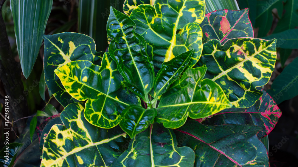Close-up of vibrant Croton plant leaves with bold yellow and green variegation, creating a natural tropical background perfect for themes of gardening, botany, and nature.