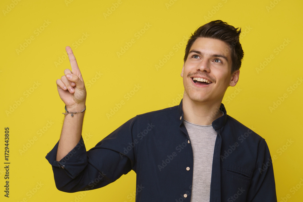 A young man, dressed casually in a blue shirt, stands against a vibrant yellow background, his finger pointing upwards as he gazes with excitement towards the unseen