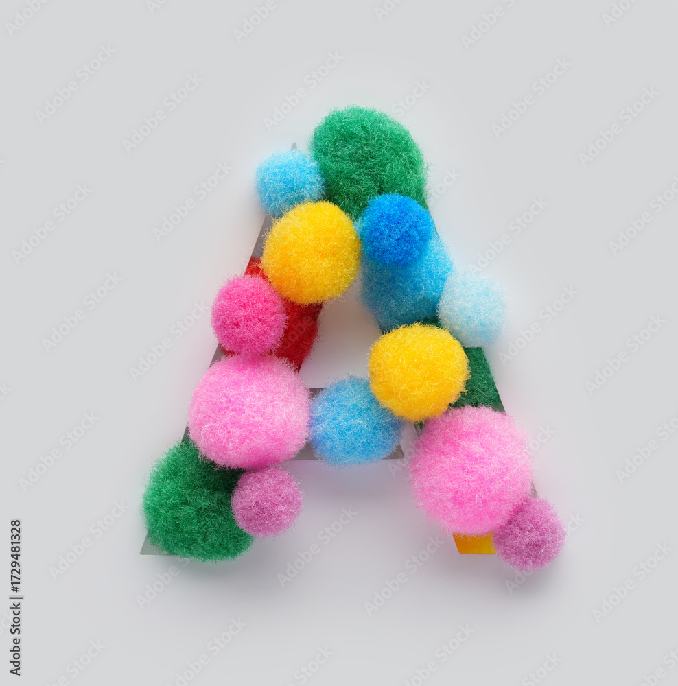 Colorful letter A made of fluffy pom poms on white background. Creative handmade typography for kids learning alphabet, educational design, playful classroom decor, and graphic projects.