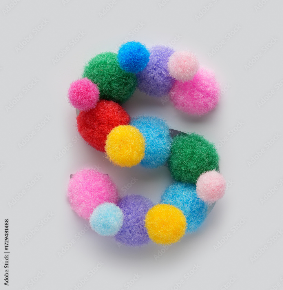 Colorful letter S made of fluffy pom poms on white background. Creative handmade typography for kids learning alphabet, educational design, playful classroom decor, and graphic projects.