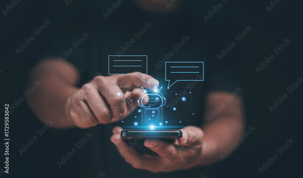 AI chatbot concept. Man holding smartphone with digital assistant icon on screen. Artificial intelligence, customer support, online communication and virtual technology for business solutions.