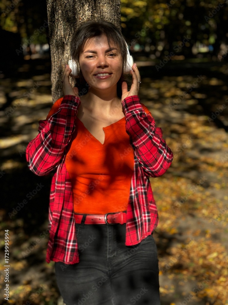 A woman listens to music in an autumn park