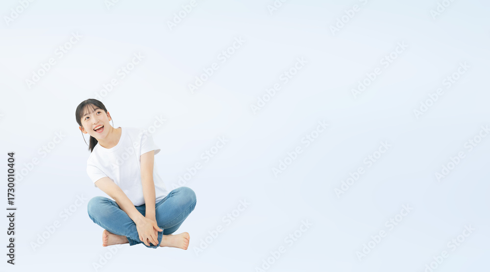 笑顔で座るカジュアルウェアを着た10代女性の切り抜き全身写真