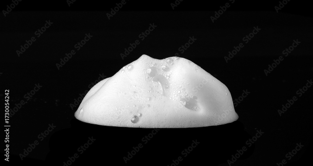 White soap foam bubble isolated on black background, symbol of cleaning, hygiene, freshness, and purity, perfect for design, household products, bath concepts, and advertising campaigns.
