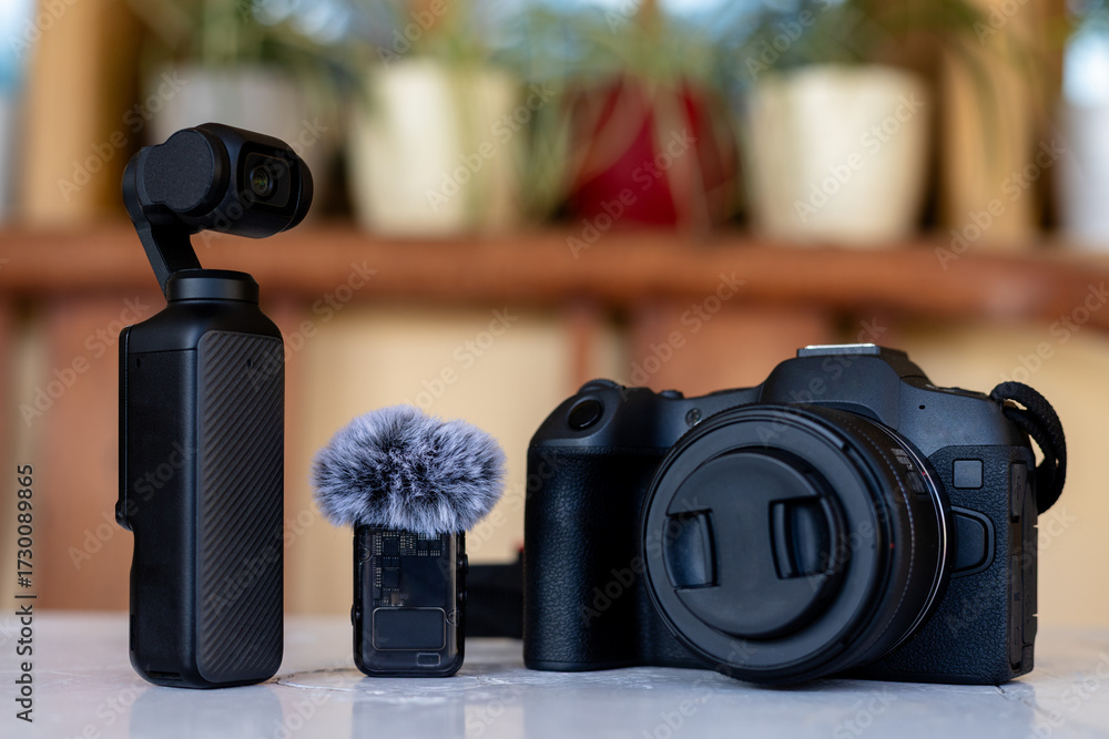 Handheld Gimbal Camera, Wireless Microphone and Interchangeable Lens Mirrorless Digital Camera on White Table with Blurred Potted Plants Background