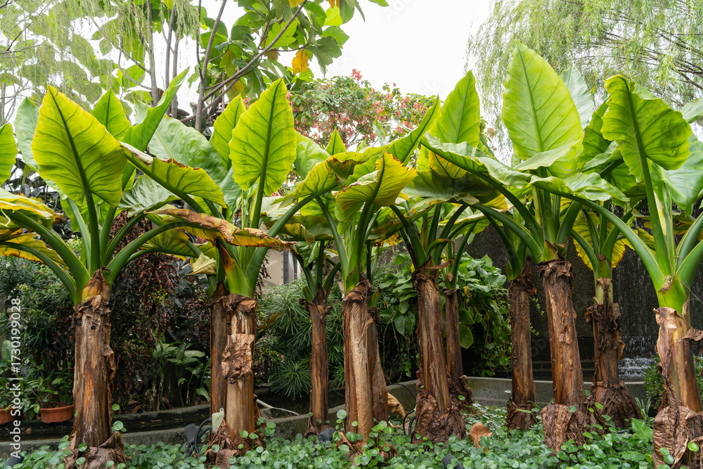 Lush banana plants grow in a green garden with large leaves, thick stems, and tropical vibe