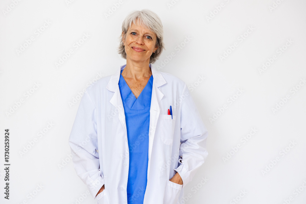 Portrait of happy senior female doctor looking at camera over white background at medical consultation in hospital