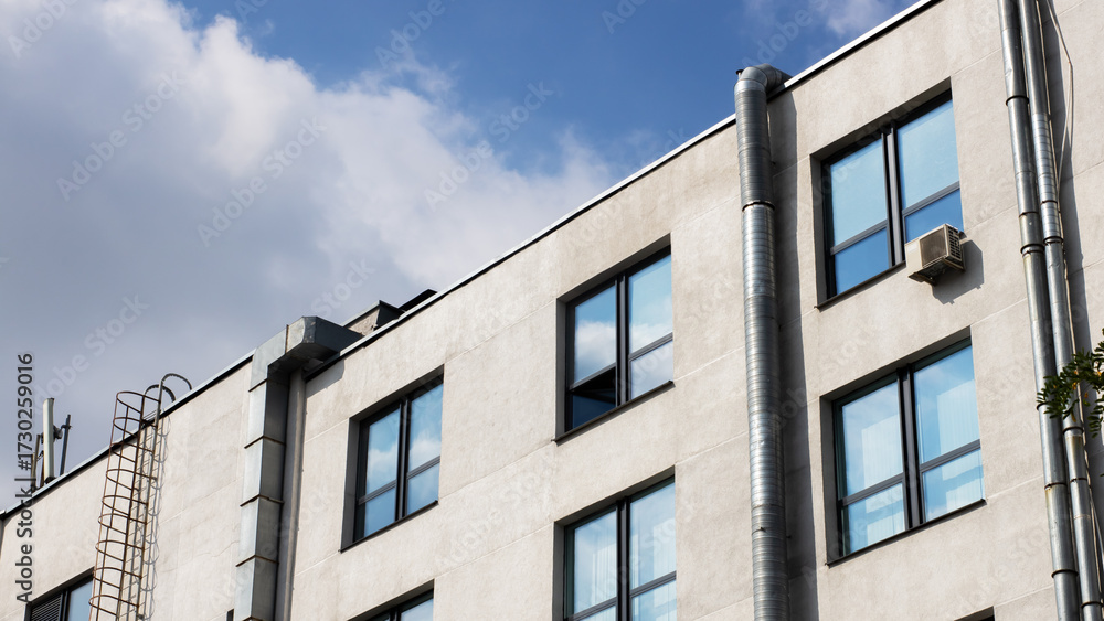 A tall building featuring numerous large windows, set against a clear blue sky