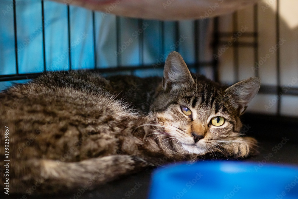 A domestic cat is comfortably laying in its cage beside a blue bowl