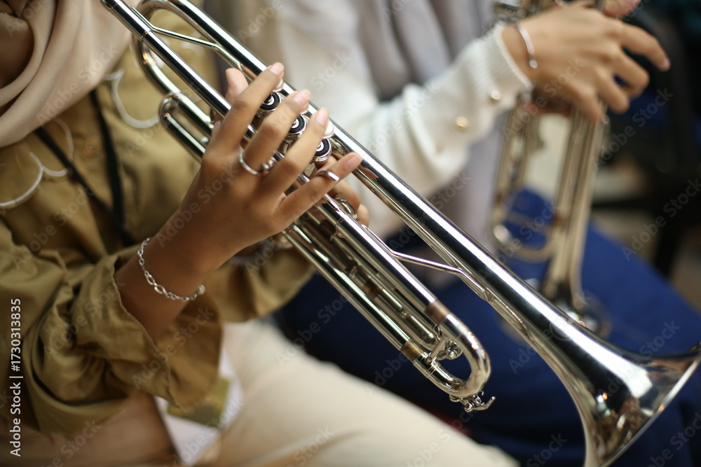 Close Up of Musician Playing Silver Trumpet on rehearsal studio