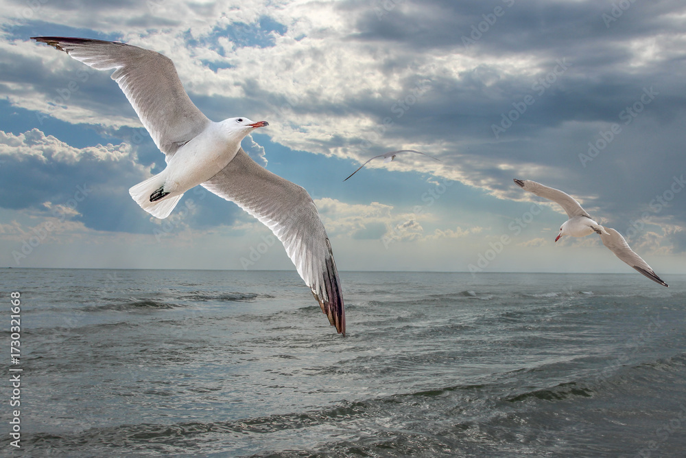 Three seagulls flying low over choppy ocean water under dramatic cloud sky