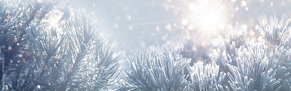 Blurred winter and christmas background with snowy pine branches and abstract golden lights in a festive holiday scene. Horizontal banner with winter design and space for text.
