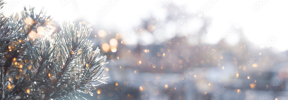 Blurred winter and christmas background with snowy pine branches and abstract golden lights in a festive holiday scene. Horizontal banner with winter design and space for text.