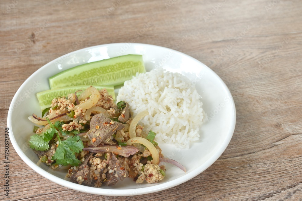 boiled chop pork with liver Thai salad taste spicy and sour on plate eat coupl rice and fresh cucumber