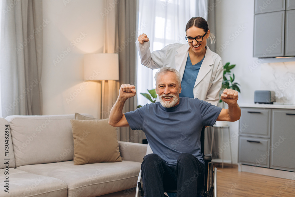 Senior man celebrating recovery with caregiver support