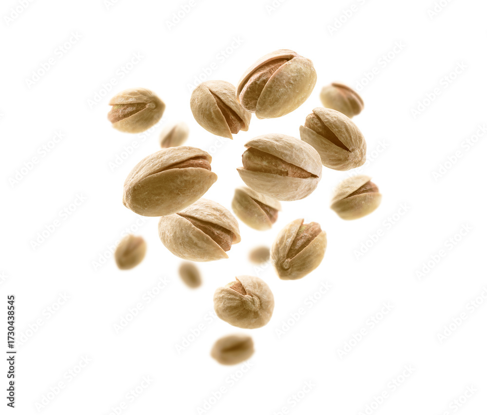 Salted pistachios levitate on a white background