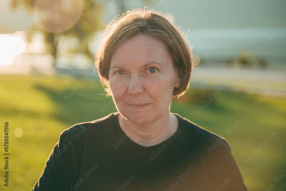 Outdoor portrait of mature brunette woman in park at golden sunset, looking at camera with intriguing smile, soft lens flare creating elegant and timeless mood.