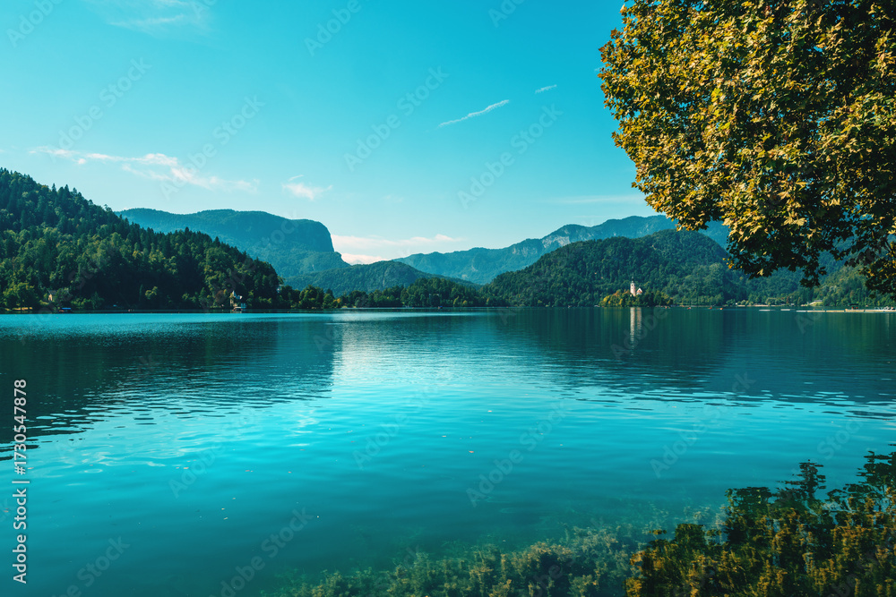 Scenic view of Lake Bled framed by tree branches with the Assumption of Maria Church in the distance.