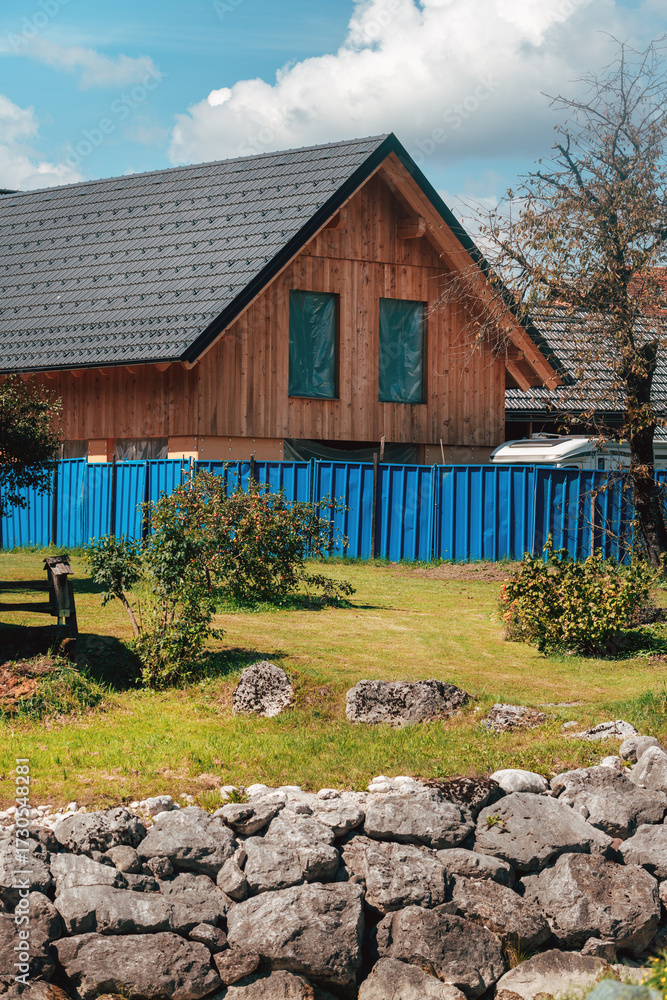 Traditional Slovenian alpine house in a mountain village surrounded by rural countryside.