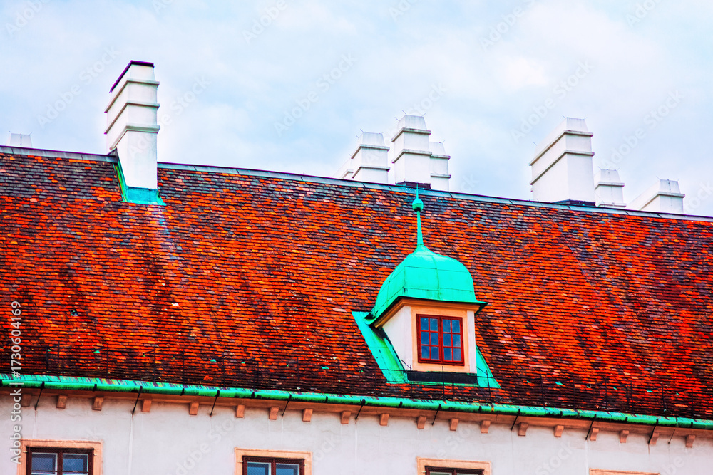 Weathered red tiled roof of Vienna Hofburg Palace, with chimneys and distinctive green domed dormer window. Historic European architecture with a blend of functional elements and ornate detailing