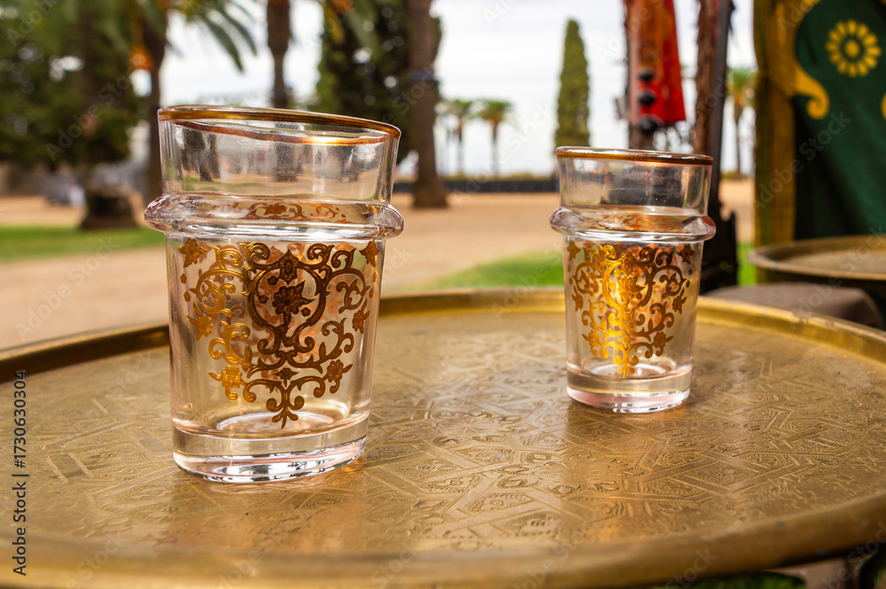 Two Elegant Teacups with Gold Adornments on a Golden Tray.