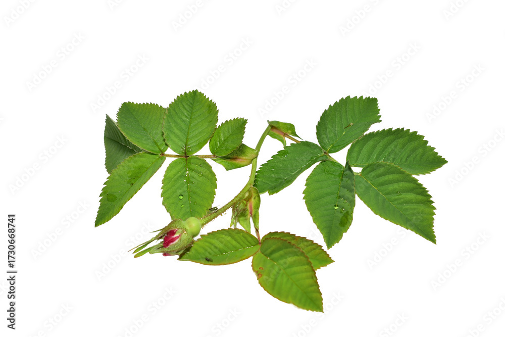Leaves and an unblown rosehip bud lie on a PNG background.