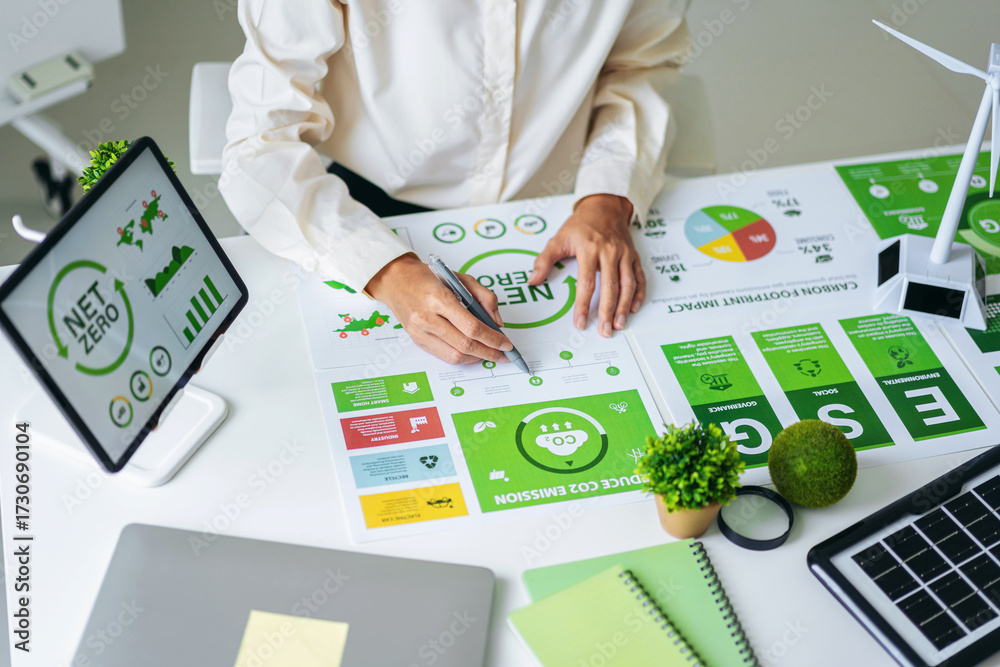 Business analyst assessing ESG net zero carbon footprint impact data for corporate sustainability strategy environmental governance
