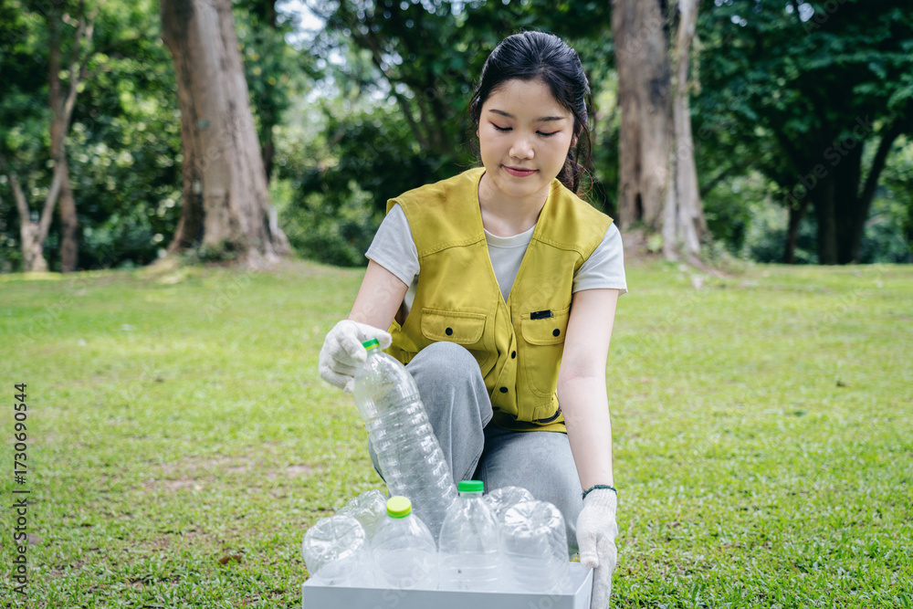 Environmental volunteer collects plastic bottles for recycling in park promoting sustainable living community action global earth cleanup efforts