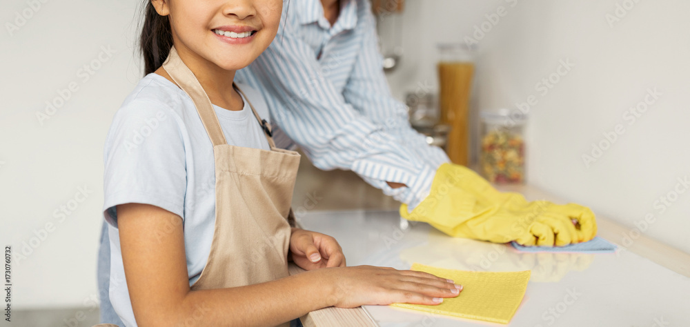 Young asian mother teaching her daughter housekeeping, cleaning kitchen together and smiling at camera, selective focus. Cute girl wiping table with cloth, enjoying helping with household chores