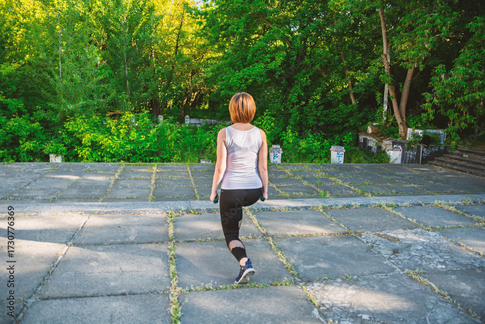 Rear view of a fit woman performing lunges with dumbbells in an outdoor urban park setting. She's focused on her fitness workout amidst lush green trees, highlighting healthy lifestyle and strength tr