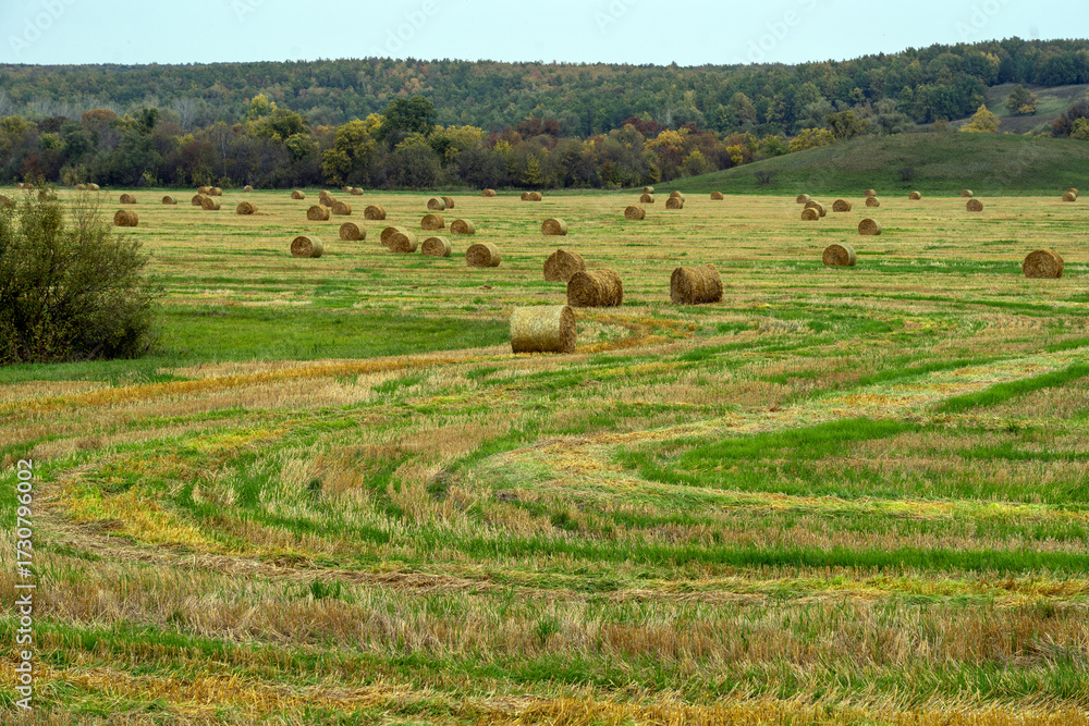 An autumn striped field with rolls of mown grass. Bashkortostan