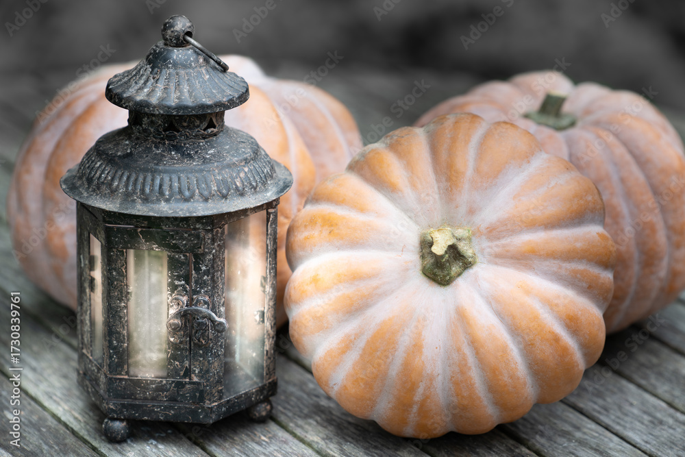 Several pumpkins lie on a wooden table. An old lantern stands next to them, casting a faint light. The background is gray.