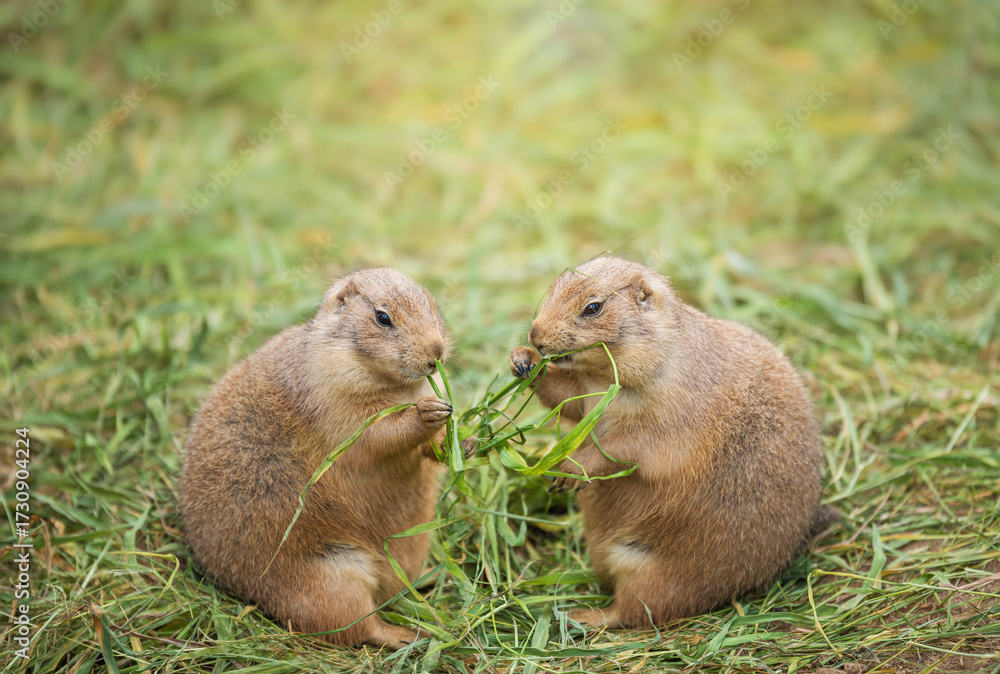 Pair of prairie dogs are sitting nearby and eating green grass. Herbivorous burrowing ground squirrels, social animal, love, animal life.