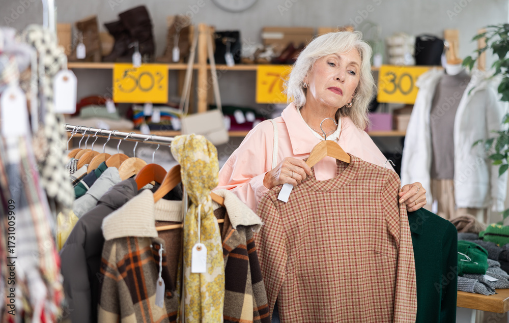 Senior woman carefully chooses a knitted dress with the addition of wool, she looks at the color and size. Buying warm clothes for autumn and winter